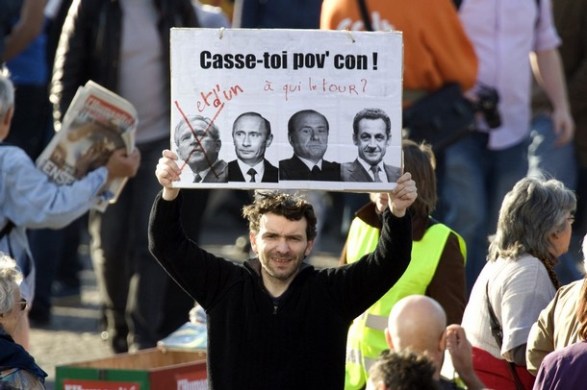 A demonstrator holds a placard which reads “get lost poor idiot! Who is next?” during a protest march with public and private sector workers in Paris March 19, 2009. Unions have called a nationwide strike across sectors and planned demonstrations all over France to denounce the government’s economic policies. REUTERS/Charles Platiau (FRANCE POLITICS BUSINESS CONFLICT)