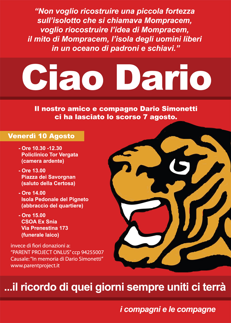 La sera del 7 agosto il nostro compagno e amico Dario Simonetti ci ha lasciato, sconfitto da una malattia atroce contro la quale ha combattuto, innamorato della vita, fianco a fianco con la sua compagna Francesca.