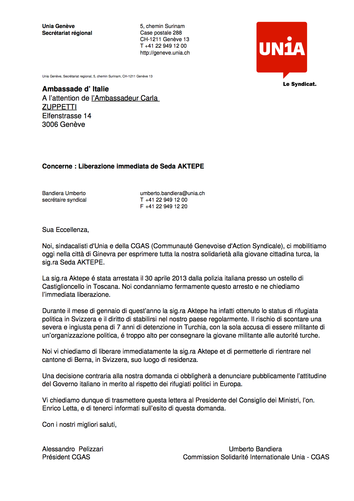 Seda ha ottenuto in Svizzera l’asilo politico. In Svizzera Seda è “legale” sotto ogni aspetto. L’Italia è tenuta a rispettare i diritti umani e assicurare la protezione dalla persecuzione politica.La nostra richiesta è chiara: noi chiediamo che la giustizia italiana riconosca il pronunciamento della Svizzera, secondo cui Seda è dichiarata rifugiata politica. Deve essere rilasciata immediatamente e in ogni caso non deve essere lasciata in balia dello stato torturatore turco. Spetta ora alla magistratura italiana, opporsi a questa situazione ingiusta.