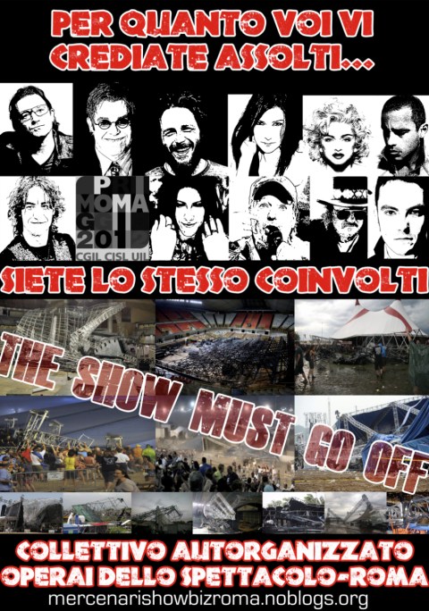 Ci piacerebbe ricordare che anche questo palco voluto dai sindacati, sia frutto, come tutti gli altri, del lavoro invisibile di molte decine di persone alle quali questo sistema produttivo non riconosce, nella realtà dei fatti, diritti ormai considerati fondamentali. Non è la sede per entrare nello specifico, ma vogliamo comunque sottolineare che figure professionali quali rigger, scaffolder e facchini che rendono possibile ogni volta il funzionamento del gigantesco macchinario dello spettacolo, lavorano senza neppure un contratto specifico per la mansione che svolgono, senza un sistema di regole relative a turni e orari di lavoro e in condizioni di sicurezza spesso esistenti solo sulla carta. Sono molti gli aspetti che necessiterebbero di un serio intervento di riforma. Basti pensare che la formazione professionale in molti casi rimane a carico del lavoratore, così come la copertura assicurativa e l’attrezzatura di sicurezza. A questo si aggiunge la poca chiarezza nell’intreccio di responsabilità e competenze tra società di produzione, promoter, service e cooperative nella gestione di tour e spettacoli live.