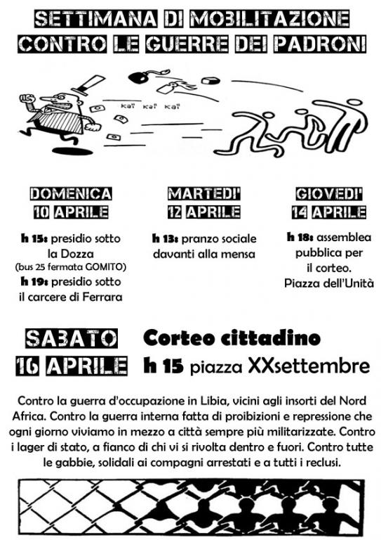Maggiori notizie ve le daremo man mano che i contorni esatti di questa vicenda si saran chiariti. Inutile dirvi, però, è che il modo migliore di star vicini ai nostri compagni bolognesi che si son ritrovati impigliati in questa vicenda giudiziaria e che per ora hanno le mani legate è utilizzar le nostre per proseguirne la lotta. I temi, del resto, sono quelli di tutti, e le occasioni non mancheranno un po’ dappertutto. Tra tutte, anche il corteo che gli arrestati prevedevano per il 16 aprile, a Bologna, del quale vi parlavano giusto ieri.