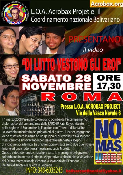 Il racconto commosso e indignato dei familiari dei giovani studenti messicani massacrati insieme ad altre 25 persone nel corso del bombardamento notturno avvenuto contro un accampamento delle FARC in Ecuador il 1 marzo 2008 da parte dell’esercito colombiano in sinergia con forze statunitensi e apparati dell’intelligence israeliana. In spregio a ogni trattato internazionale tra Stati e al Diritto Umanitario.