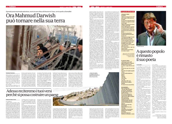 Ancora un saluto a Mahmoud Darwish, grande poeta della terra e dell’ulivo.