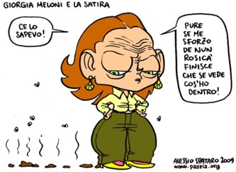 E tra ieri e oggi la rabbia è diventata furia di dirne di peggio, senza l’ausilio della satira, perchè se c’è chi può scherzare sulla fisicità del premier mentre tutti ridono non si capisce come mai la meloni debba essere trattata con riguardo. Come dire ad un caricaturista di salvare i dettagli per le donne e di fare gobba e orecchie a sventola solo ad andreotti.