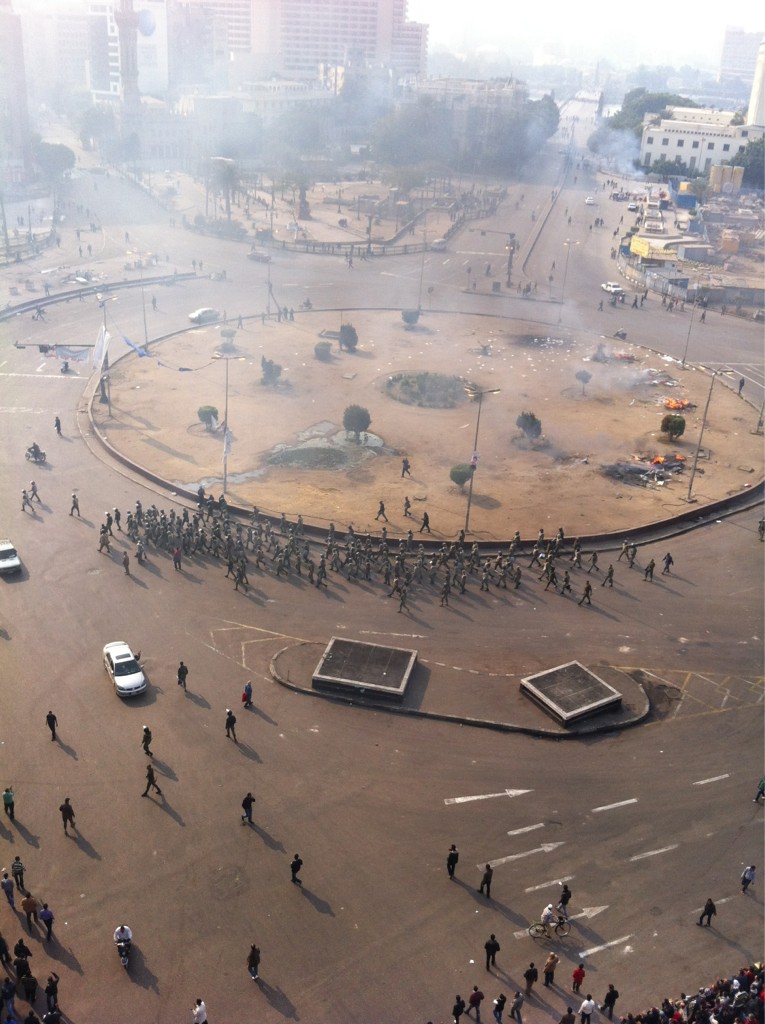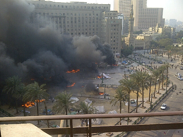 Spazzati via i manifestanti da Qasr al-Aini, da Qasr al-Nil, da piazza Tahrir e da Talaat Harb: tutto il quadrilatero, territorio dei manifestanti da gennaio, è stato sgomberato con una violenza inaudita che ha già fatto otto morti nelle precedenti ore e che in questi momenti starà uccidendo a più non posso.