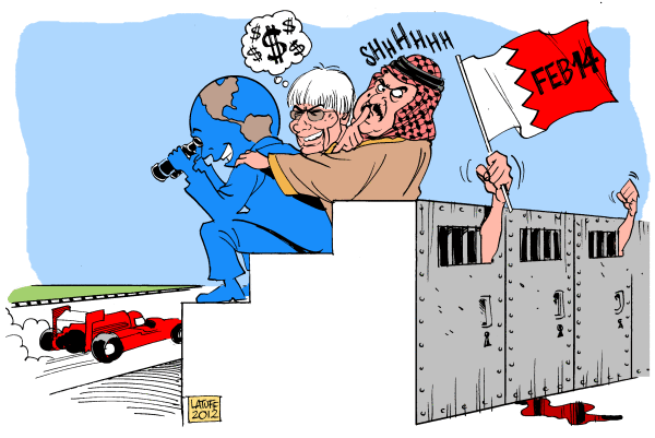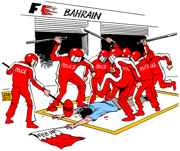 SPARITE! Vista la vostra indifferenza non siete ben accetti: alla velocità delle vostre veloci macchine milionarie, tornatevene nelle vostre belle case, e lasciate almeno che nessun riflettore gioioso si accenda in terra di Bahrain, che in questi mesi ha visto più funerali che nascite.