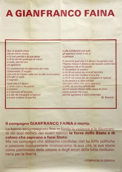 muore per una grave forma tumorale nella abitazione di Pontremoli dove si trovava in libertà provvisoria da 2 mesi, il Prof. Gianfranco Faina, la cui liberazione era stata richiesta nel corso della rivolta del carcere di Trani di due mesi prima. Professore di lettere alla università di Genova, era stato lui a presentare al collega Prof. Enrico Fenzi il dirigente della colonna genovese delle BR Micaletto ed era stato tra i fondatori di Azione Rivoluzionaria, definita da Mario Moretti «organizzazione vicina a posizioni anarchiche e contraria a tutte le ideologie», e per la quale verranno inquisite 86 persone. La storia di AR inizia nel 1977 quando alcuni militanti dell’area anarco-libertaria, prendendo atto dei “caratteri di forza” espressi in particolare dal Movimento del ’77 e facendo riferimento alle elaborazioni culturali del situazionismo e della Rote Armee Fraktion (RAF), danno vita all’organizzazione armata Azione Rivoluzionaria. Le tesi politiche generali di questo raggruppamento sono esposte in “Primo documento teorico”, gennaio 1978.