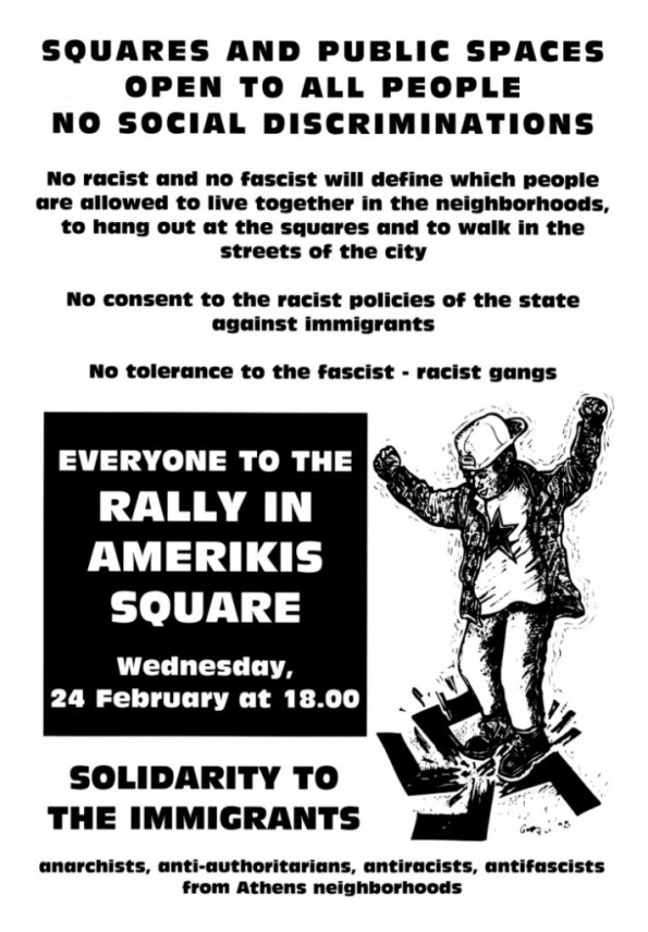 Oltre alle mobilitazioni per lo sciopero generale, le organizzazioni studentesche, il blocco anarchico e altre organizzazioni avevano un secondo appuntamento pomeridiano in piazza Amerikis: una manifestazione Antifascista e Antirazzista in un quartiere che sta subendo (dopo anni di pacifica convivenza con molte comunità migranti da), oltre ad un incremento costante della repressione poliziesca, costanti attacchi da parte dei gruppi di estrema destra.