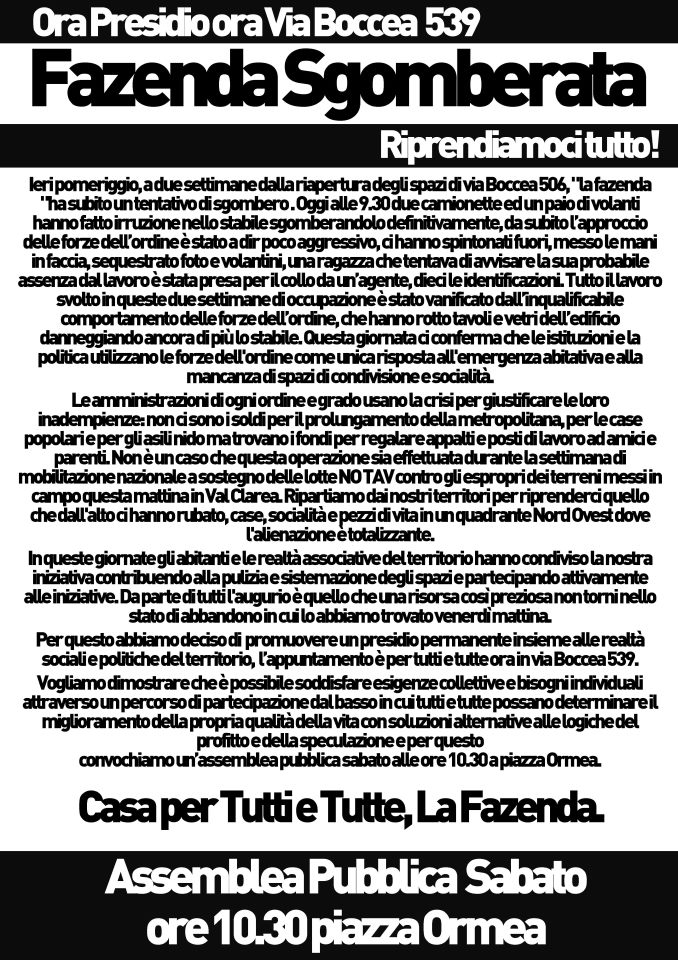 Allora che aspettiamo? Il tiranno che ci governa è a Roma! A Roma è il mandante politico dell’invasione militare della Valle, a Roma è il mandante politico del Tav: decrepito, vergognoso e trasversale, proprio come in Spagna, proprio come in Grecia. A Roma sono i palazzi che hanno partorito una manovra di assassinio di due o tre generazioni, e mentre con una mano rapinano gli italiani di 20 miliardi di euro, con l’altra firmano gli accordi con la Francia per regalarne 22 al malaffare, distruggendo con il Tav le nostre vite e la nostra vallata. Mentre già discutono la necessità di una manovra bis per attaccare ancora più a fondo, in nome dei diktat della BCE, la società italiana, spendono 90.000 euro al giorno per gasarci al CS e reprimere in ogni forma il nostro dissenso, per la sola colpa di esserci ribellati al loro decennale strapotere. Questo è ormai la Val di Susa, del resto: un pericoloso esempio per tutte e tutti, da sradicare con la forza. Cosa aspettate? Cosa aspettiamo? Se vogliamo un futuro, un futuro qualsiasi, non abbiamo scelta: dobbiamo sfidare la casta – tutta la casta! – e dobbiamo vincere. A Roma ci saremo per sentire ancora il vostro abbraccio, dopo mesi difficili in cui abbiamo sofferto, ma anche sognato; e tra i nostri sogni ci sarà sempre quello in cui vi vediamo marciare fin sotto i palazzi del potere, e lanciare tutti insieme il grido che arriva, forte e chiaro, dalla Spagna: Que se vayan todos!
