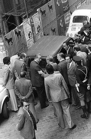 Il Professor De Tormentis, a destra delle Renault: all'epoca 44enne. Pochi giorni dopo questo scatto si accaniva sul corpo di Triaca