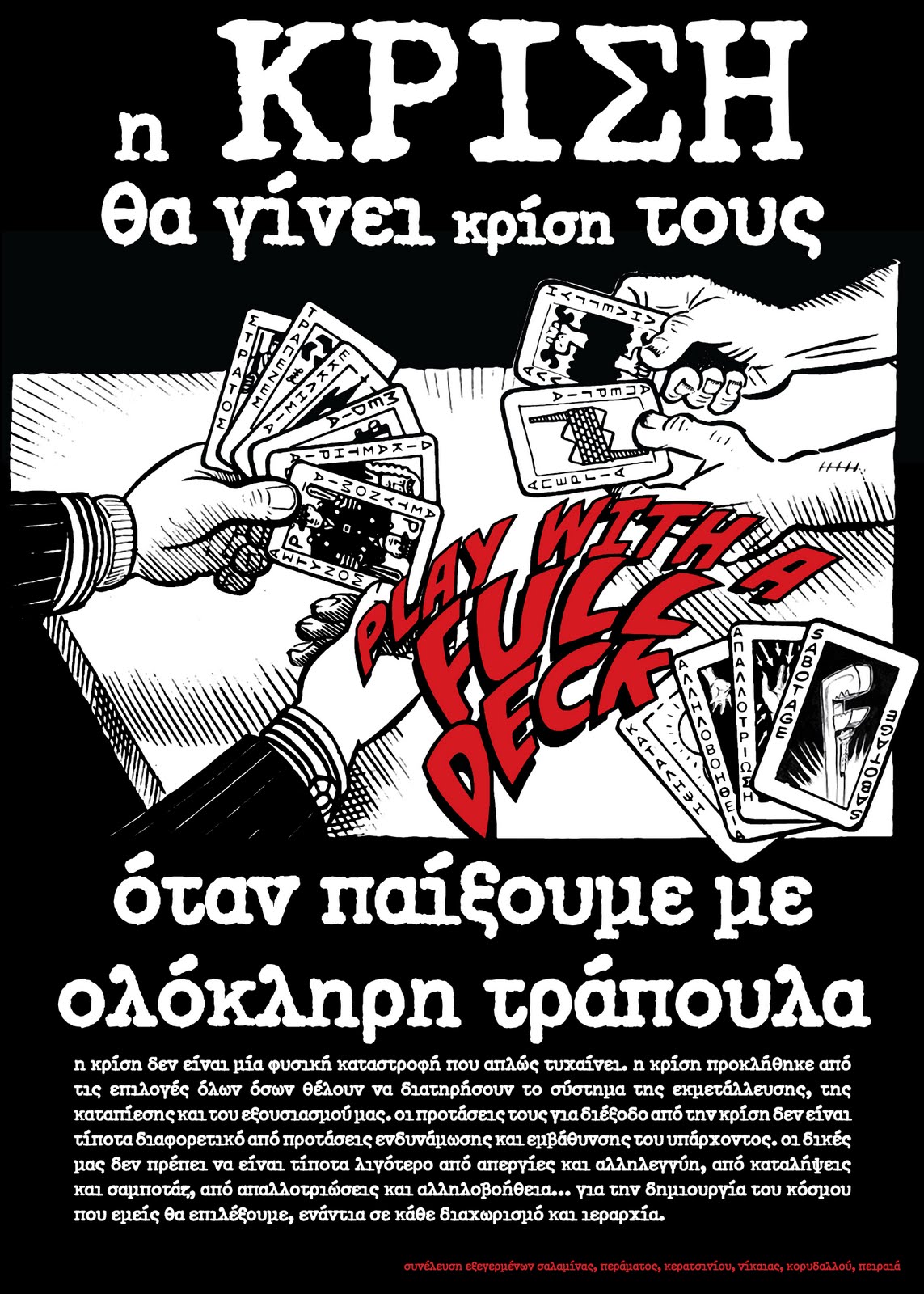 The crisis is not a natural disaster that simply happens; the crisis is the outcome of the choices of all those who want to maintain this system, in which we are exploited, repressed and governed. Their proposals on how to come out of the crisis do not differ from suggestions on how the existing situation could be reinforced and take root. Our propositions can be nothing less than strikes and solidarity, occupations and sabotage, expropriations and mutual help… in order to create the world that we choose for ourselves, against all kinds of segregations and hierarchy.