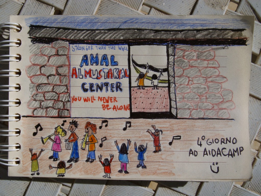 Il centro Amal al Mustakbal di Aida Camp funziona bene, la mattina c’è la scuola per i bambini fino a tre anni, il pomeriggio i corsi di dabka (la danza tradizionale che si balla a tutte le età) e inglese per quelli più grandi. Con i soldi raccolti in italia si stanno facendo molti lavori di ristrutturazione e messa a norma, si pagano le bollette, si cerca di dare un rimborso alle volontarie che ci lavorano. Insieme ai bambini facciamo 2 murales