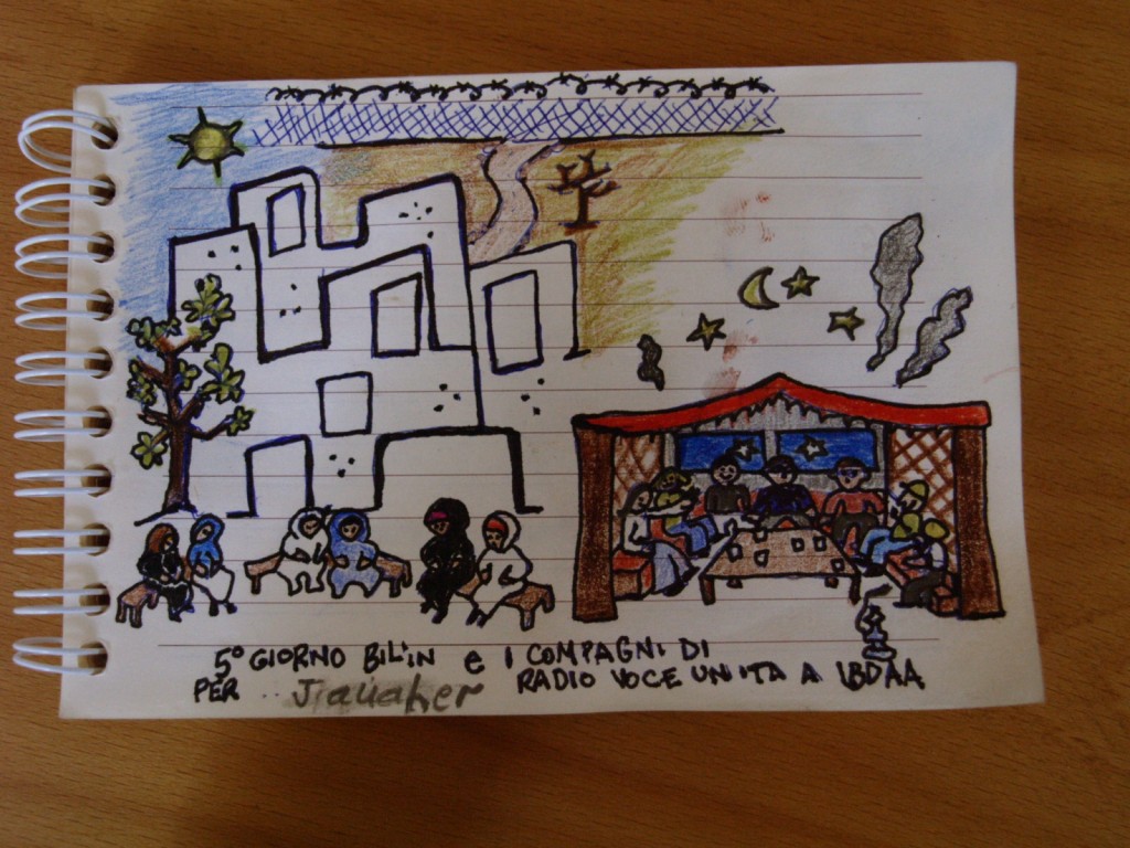 Radio Voce Unita è nata da pochi mesi a Deisheh Camp. Ci lavorano compagni con tanti anni di prigione alle spalle. La loro idea è fare una radio di tutti, lontana dalle influenze dei partiti, ma vicina ai bisogni dei palestinesi. E che dia un apporto culturale alla Palestina di oggi che invece vede sempre più nella religione le uniche risposte alle tante domande disattese. Tutti i venerdì in molti villaggi della Palestina i comitati di resistenza non violenta organizzano manifestazioni e azioni contro il muro che li isola e frammenta. Bil’in, 800 persone, un pezzo di terra rossa e ulivi, pietre, una rete lunga come l’orizzonte, dietro a questa una strada sterrata su cui passano solo mezzi militari, qualche altro centinaio di metri e il muro vero e proprio. Poi dietro ancora, in cima a una cava la colonia di Kiryat Sefer.