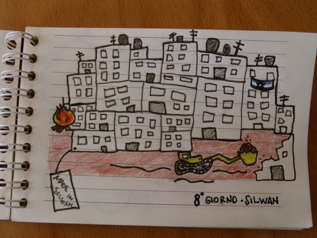 Il campo profughi di Balata è sempre particolarmente sofferente e segnato dalle numerose incursioni militari che ci sono state negli anni, ha un gran numero di morti ammazzati per mano israeliana di cui molti bambini. Abbiamo incontrato i volontari dell’Happy child wood club e con loro abbiamo immaginato la possibilità di tornare. Nablus rimane una delle città più belle e più accoglienti della Palestina. Consigliamo sempre una visita in questa città resistente circondata dall’alto da sempre più colonie. Sulla strada tra Balata e Nablus l’Autorità Palestinese sta costruendo uno dei più grossi carceri che la storia della Palestina ricorsi. Questo per rendervi l’idea di cosa si respira oggi in quella terra repressa anche da questo. Silwan è un quartiere palestinese di Gerusalemme Est dove ogni giorno ci sono sgomberi e demolizioni per insediare nuove famiglie di israeliani, poi costrette a vivere sotto scorta sotto lo sguardo giustamente ostile dei residenti. Abbiamo incontrato il comitato, che tra i molti problemi ha denunciato una fortissima repressione soprattutto verso i ragazzini che cercano di contrastare l’occupazione.