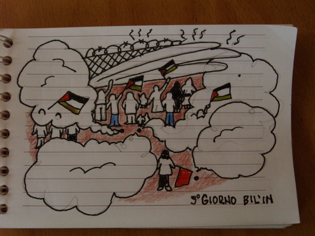 La manifestazione si è fatta però, con 800 persone, la rete è stata tagliata in alcuni punti. L’esercito ha reagito con lacrimogeni, bombe sonore e gas. A causa delle inalazioni due giorni dopo morirà Jawaher Abu Rahmah, sorella di Bassem, diventato un po’ il simbolo della resistenza di Bil’in, ucciso 2 anni fa da un lacrimogeno ad altà velocità. Siamo state a Bil’in qualche giorno dopo a portare la nostra solidarietà e abbiamo deciso di tornarci per il corteo del venerdì successivo